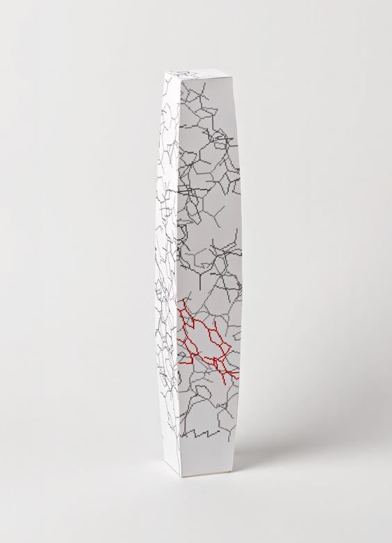 The linear design of lead inlay in the marble surface of the sculpture ‘maps’ the structure of the molecular protein Myoglobin revealed by Nobel Prize winner Sir John Kendrew in 1957.